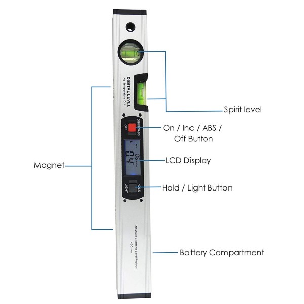 MEASUREMENT RANGE – Measure inclination angle 4 x 90˚ (total 360˚) 4 STRONG BUILT-IN MAGNETS – Magnetic base for fixed mounting on metal surfaces…