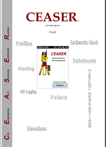 CEASER is a Windows Mobile based program, which has been developed to assist the Engineering and Topographical surveyor through all phases of a surveying project. It releases the surveyor from all pre-calculations necessary to set out any phase of a project that can be defined by Geometric Parameters, Tin Models, Strings, Platforms, Arcs, Tubes, Tunnels or Coordinates. The surveyor can set up anywhere on the project, observe a minimum of two known reference points, and immediately setout or check anything on the project, without having to set anything on the instrument nor do any calculations. The surveyor can on the fly change from a Level to a Total Station to a GPS, while busy with a Job.